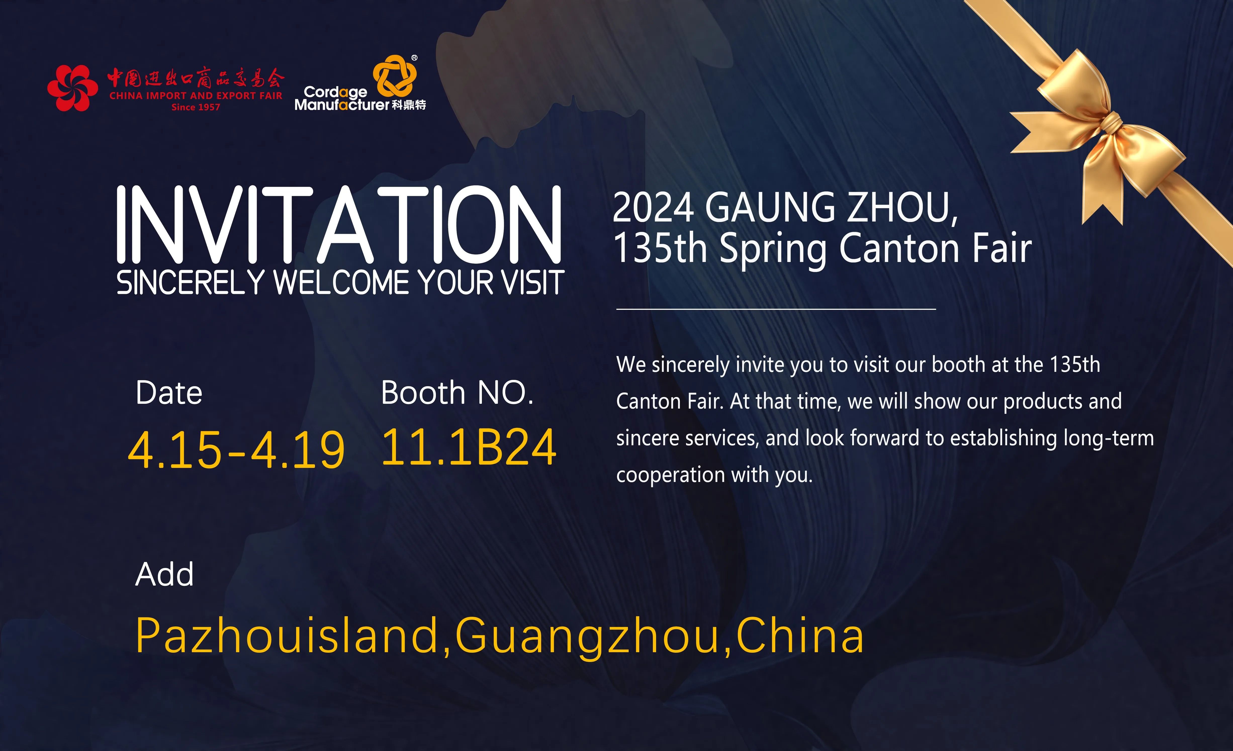 Le invitamos sinceramente a usted y a los representantes de su empresa a visitar nuestro stand en la Feria de Cantón.
